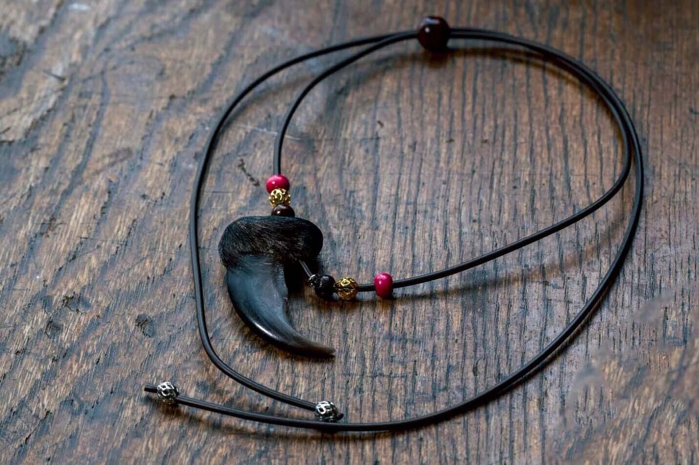 知床で捕獲されたヒグマの足の爪をネックレスに加工しています。